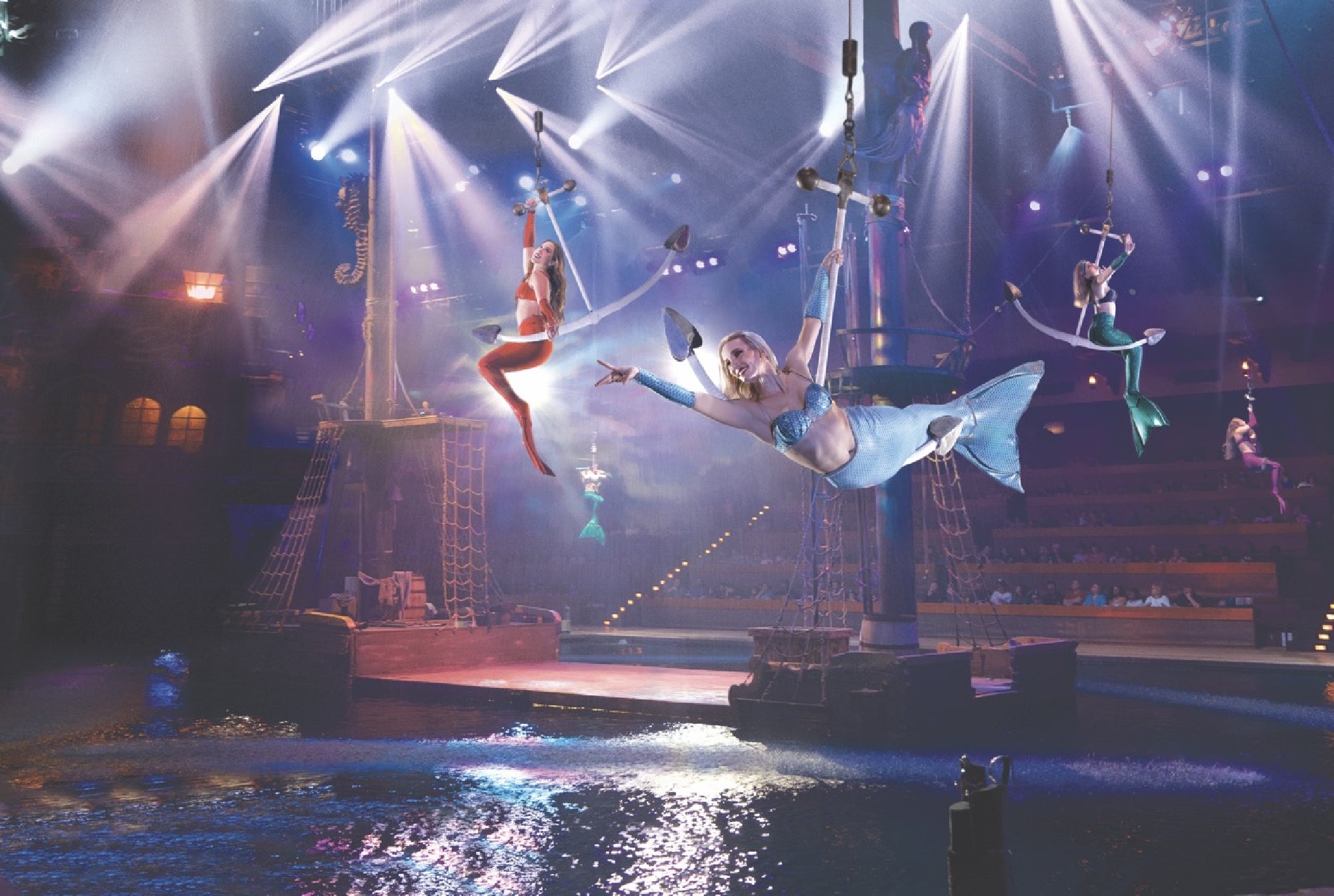 • Enjoy an immersive experience filled with aquatic acrobatics, stunning aerial stunts, live animals, and special effects, all set aboard a pirate ship.